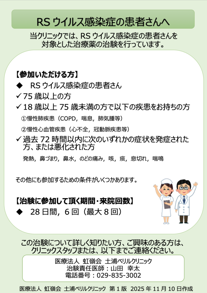 治験は、国の基準に基づいて安全性や有効性を確認する大切な医療研究のひとつです。土浦ベリルクリニックでは、新型コロナウイルスの治療薬における治験に協力しておりますので、ご興味やご質問のある方は、医師またはスタッフまでお気軽にお声かけください。